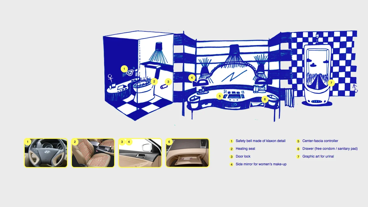 03. The toilet is women’s secret place. They fix their make-up, make a phone call, have small talk and so on, so the toilet should maintain pleasant atmosphere. Sonata’s inner details will make the place comfortable and witty. The dressing table is inspired by Sonata’s dashboard. Side mirrors will help girls powder their nose, and every drawers has free condoms and sanitary pads. Women’s toilet has a safety bell and a door lock designed as the Sonata’s horn and inner door. Men’s urinal has a humorous graffiti preventing make other parts dirty.