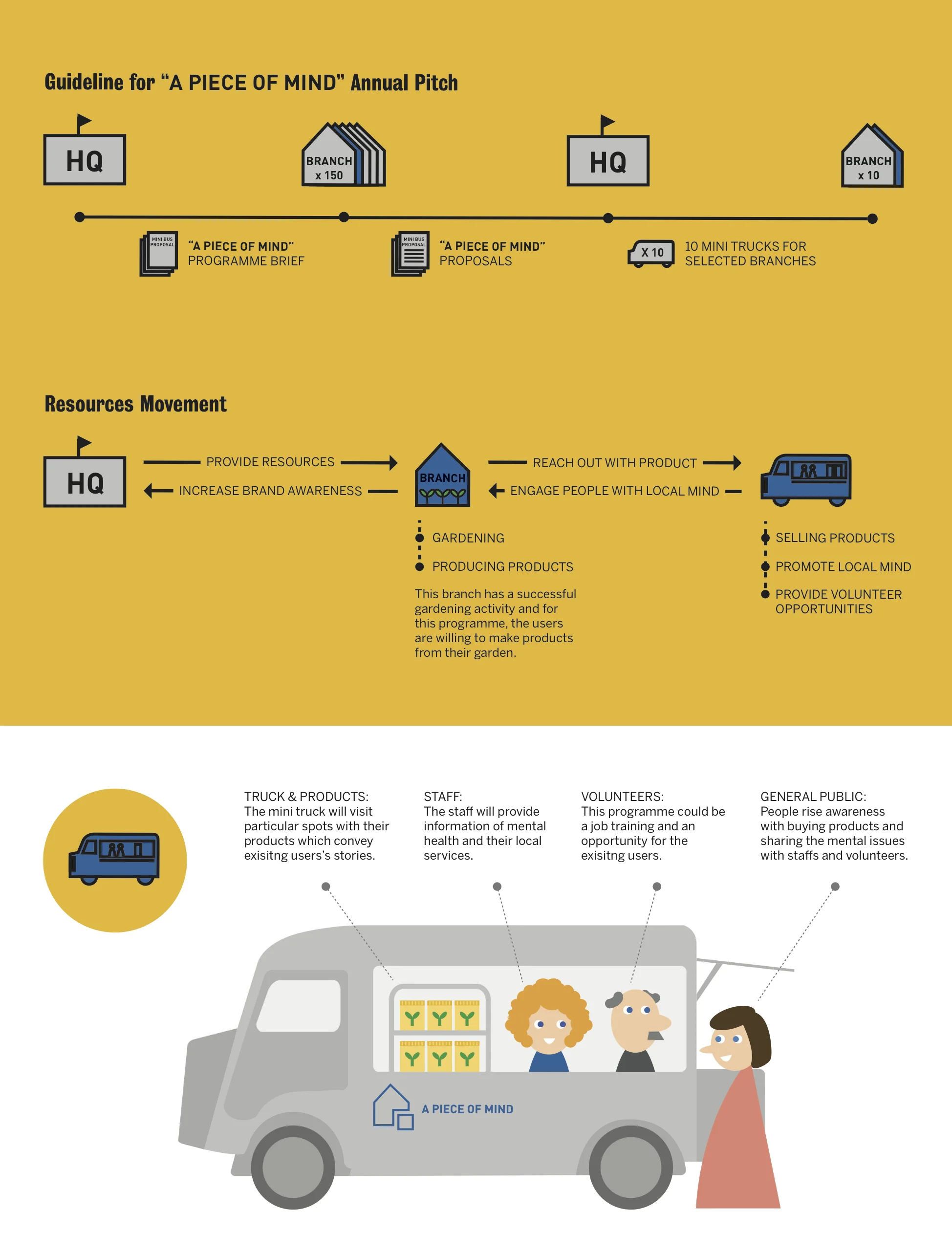 ‘A PIECE OF MIND’ is a smaller version of Local Mind. It delivers the basic information about Mind services, mental health issues and products that have been made by Local Mind users. It will take a piece of their atmosphere and service out to general public.