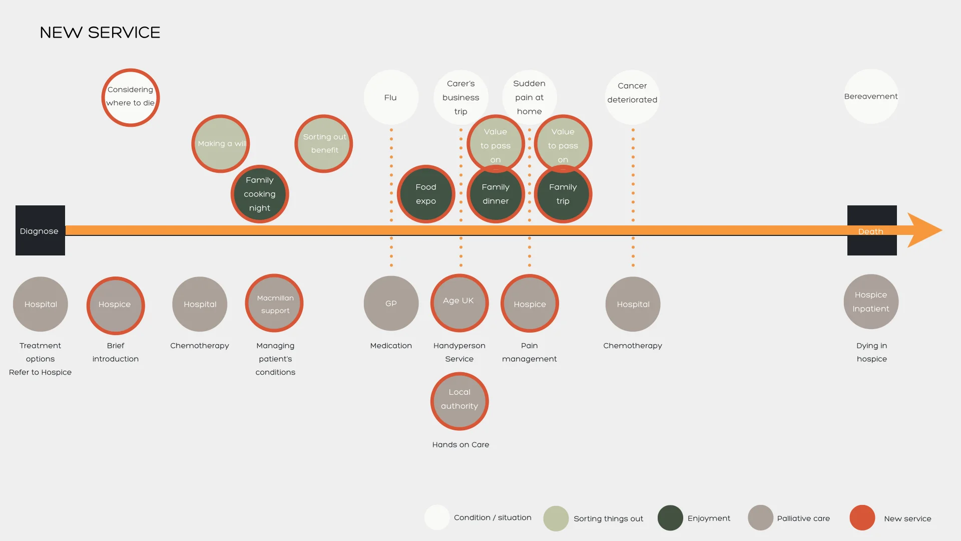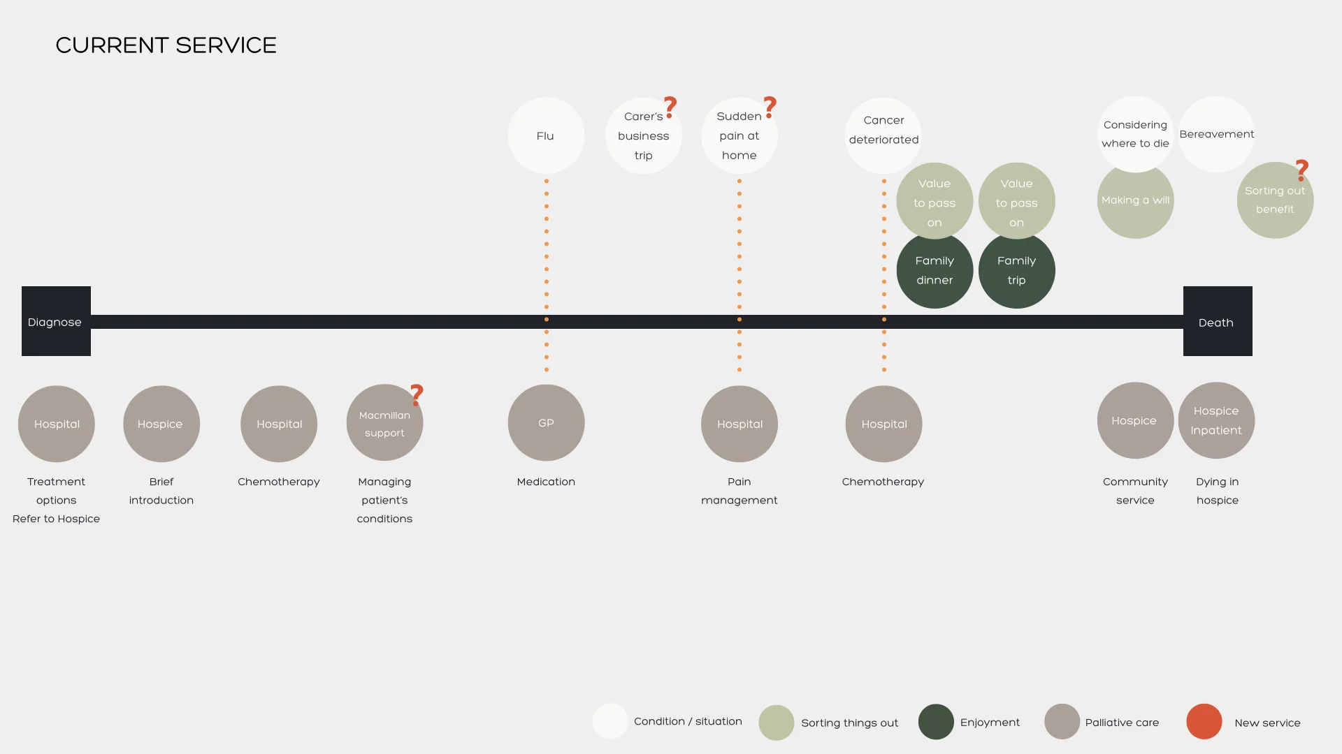 Royal Trinity Hospice provides end of life care to individuals and support for families in central and South West London community. They deliver various services such as care at home, day services and outpatient activities. However, how people perceive hospices is mostly about the last-moment care. In 2o16, Royal Trinity Hospice will open a new centre in North Bank to extend their reach in North London. We see an opportunity to develop a holistic service for patients, carers and healthcare professionals by rethinking the concept of both living and dying, and encouraging users to engage with Trinity's services at an earlier stage.