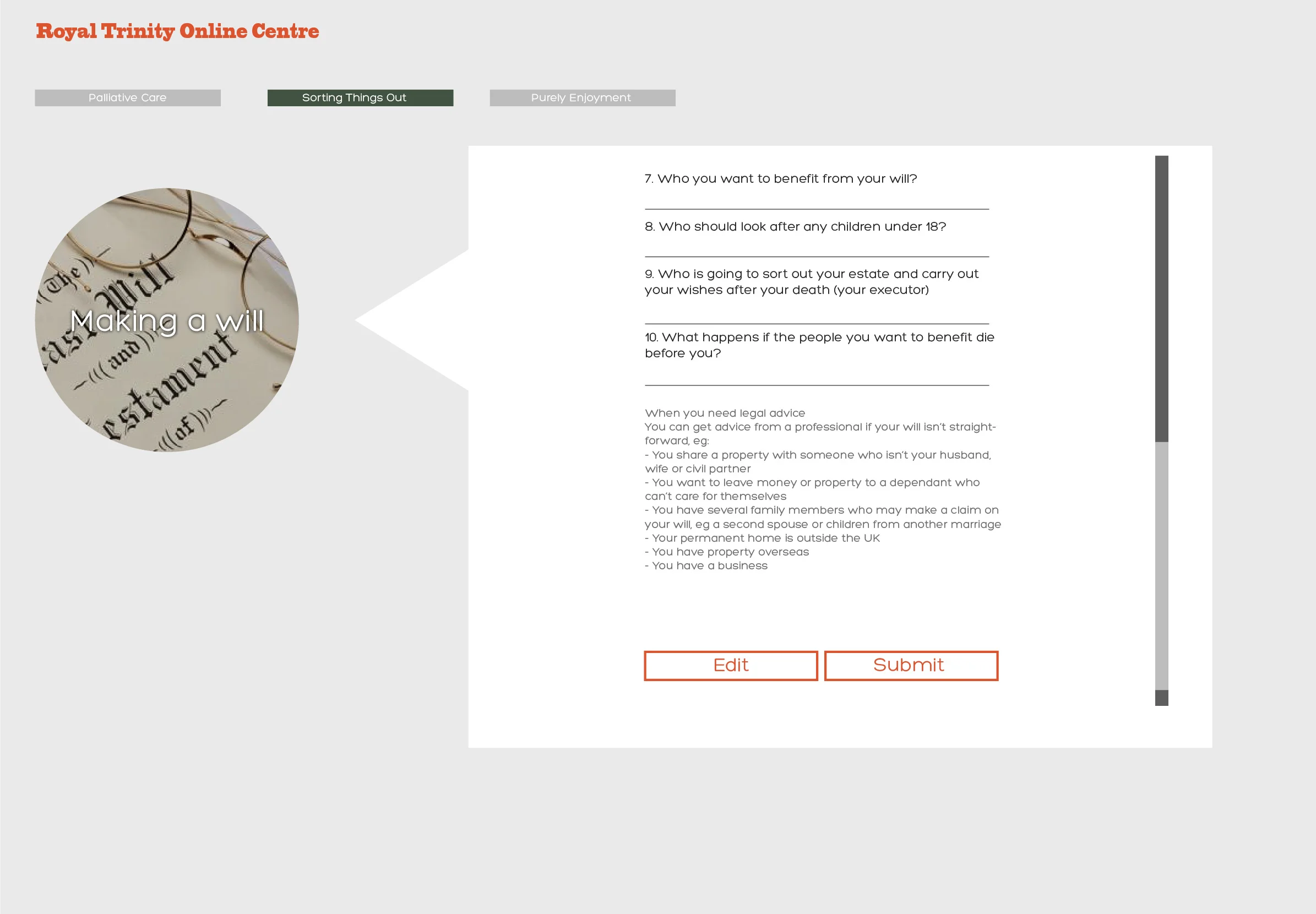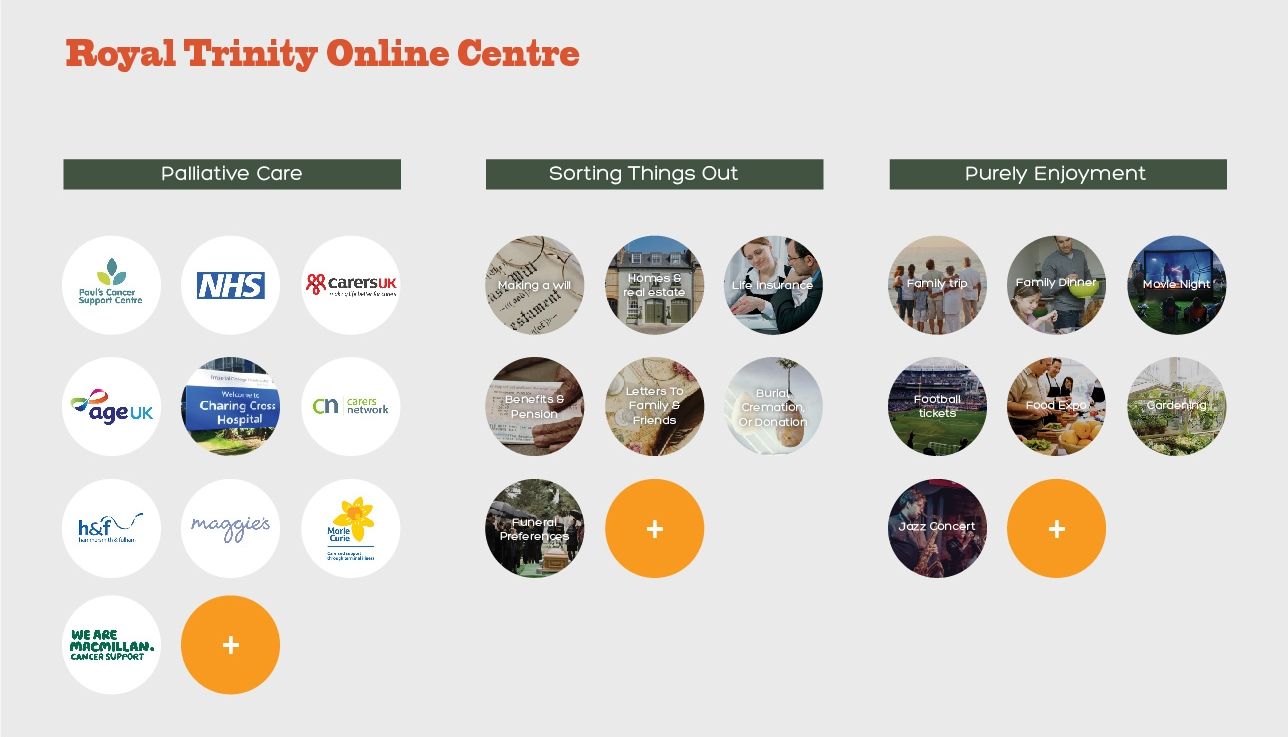 There are a number of different organisations and resources within palliative care such as maggie centre, Marie Curie, and Macmillan. People find it difficult to navigate themselves through different support and to understand what benefits they are entitled to. During the first assessment, a hospice nurse opens an account for a patient on the "Royal Trinity Online Centre". This online platform helps nurses deliver tailored services to signpost patients to find right services at the right time.